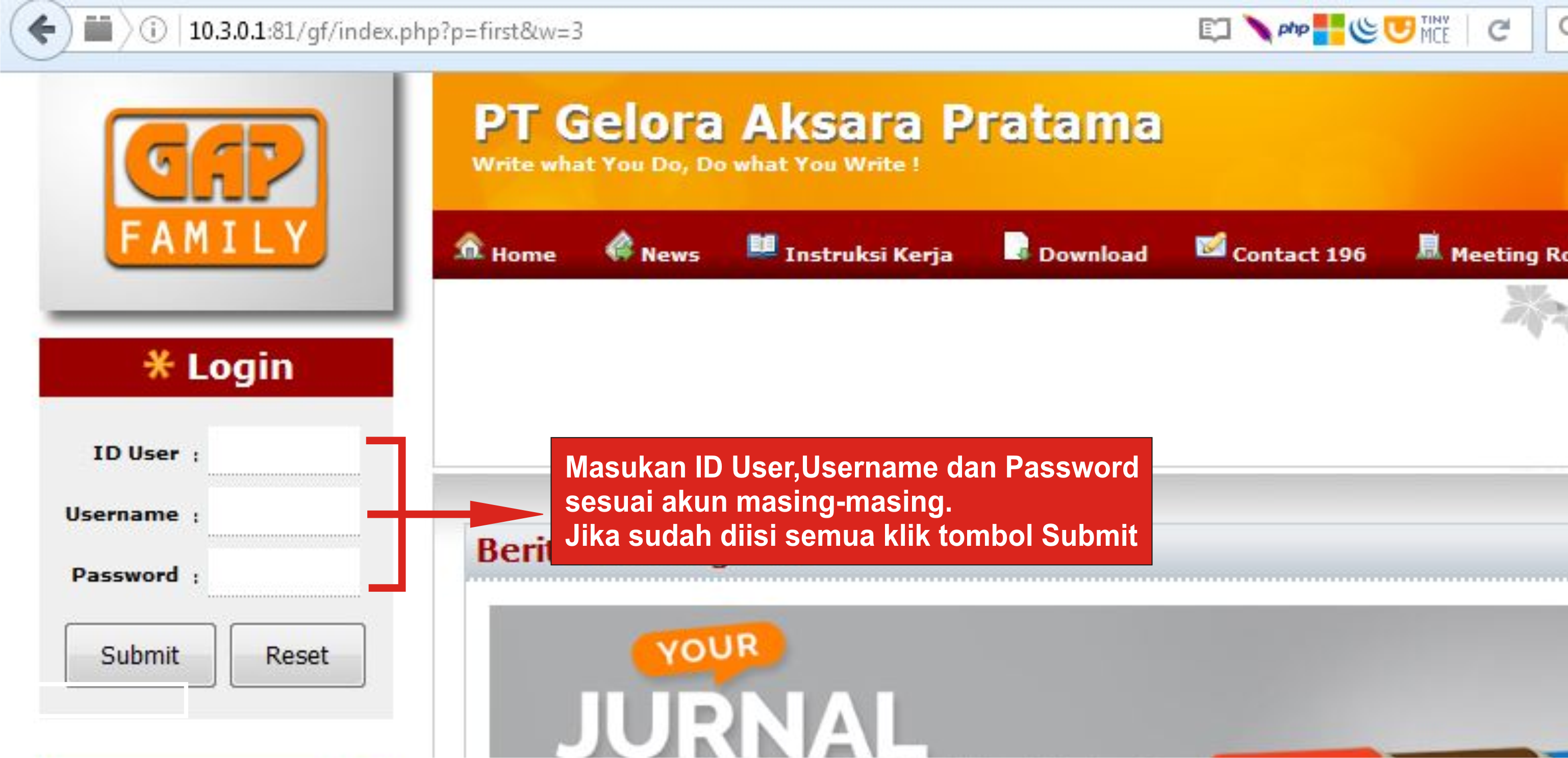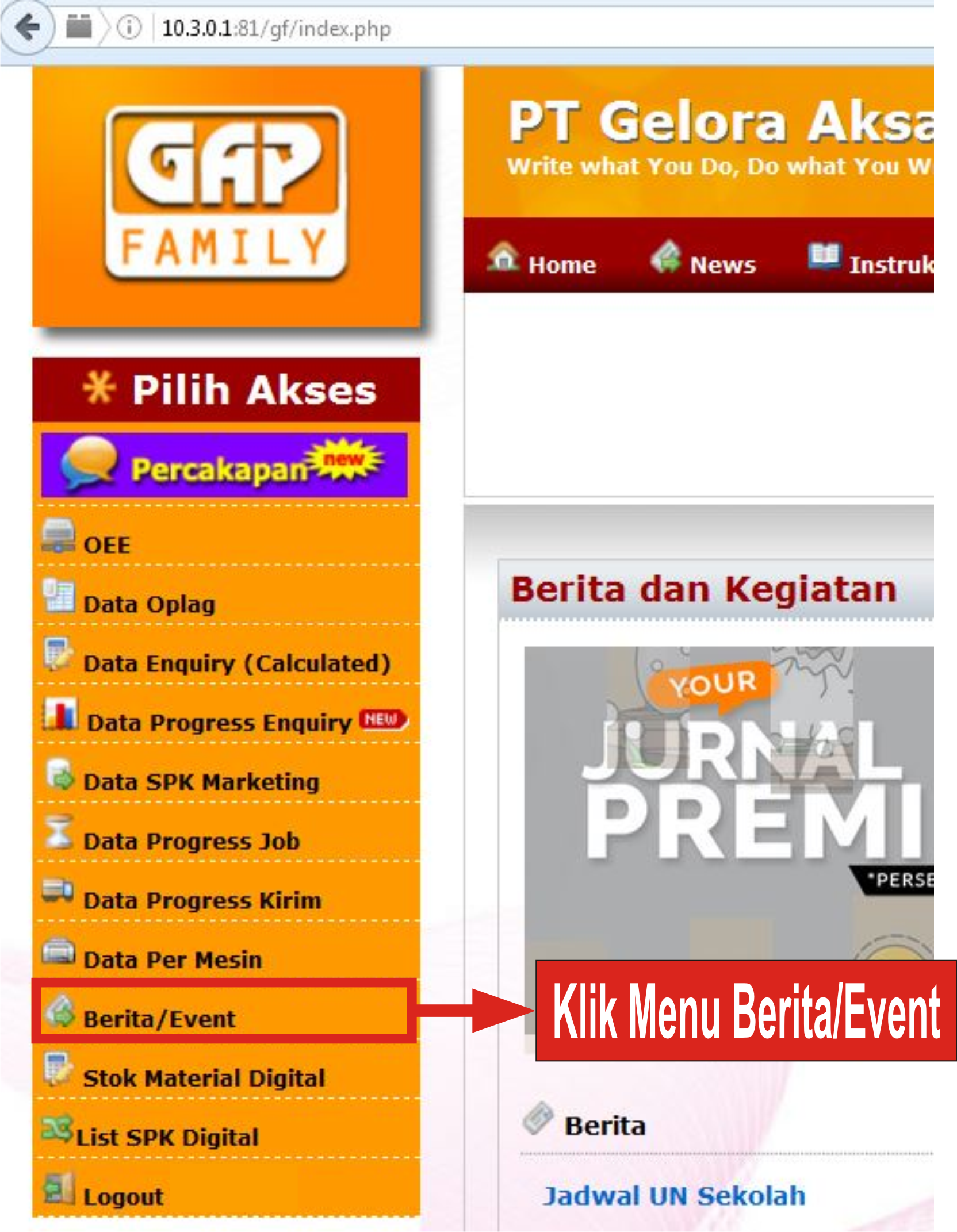 Pada tutorial ini akan di jelaskan cara membuat Berita / Event pada GAP Family.Anda bisa membuka situs GAP Family melalui dua cara yaitu Internal dan Eksternal. Mengakses lewat internal dengan cara mengunjungi http://10.3.0.1:81 pada browser, dan pastikan koneksi terhubung dijaringan PT.Gelora Aksara Pratama, sedangkan jika menggunakan koneksi diluar PT.Gelora Aksara Pratama anda harus mengakses situs http://61.8.73.254:81.