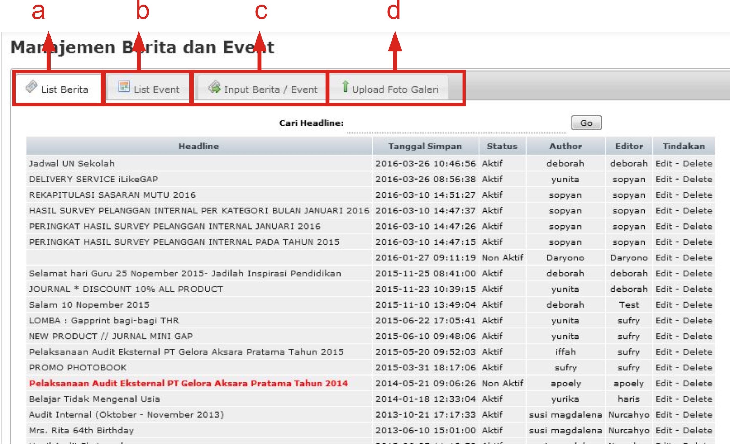 - Pilih Menu List Berita atau List Event lalu cari judul berita/event yang akan diubah statusnya,kemudian klik Edit. Contoh :