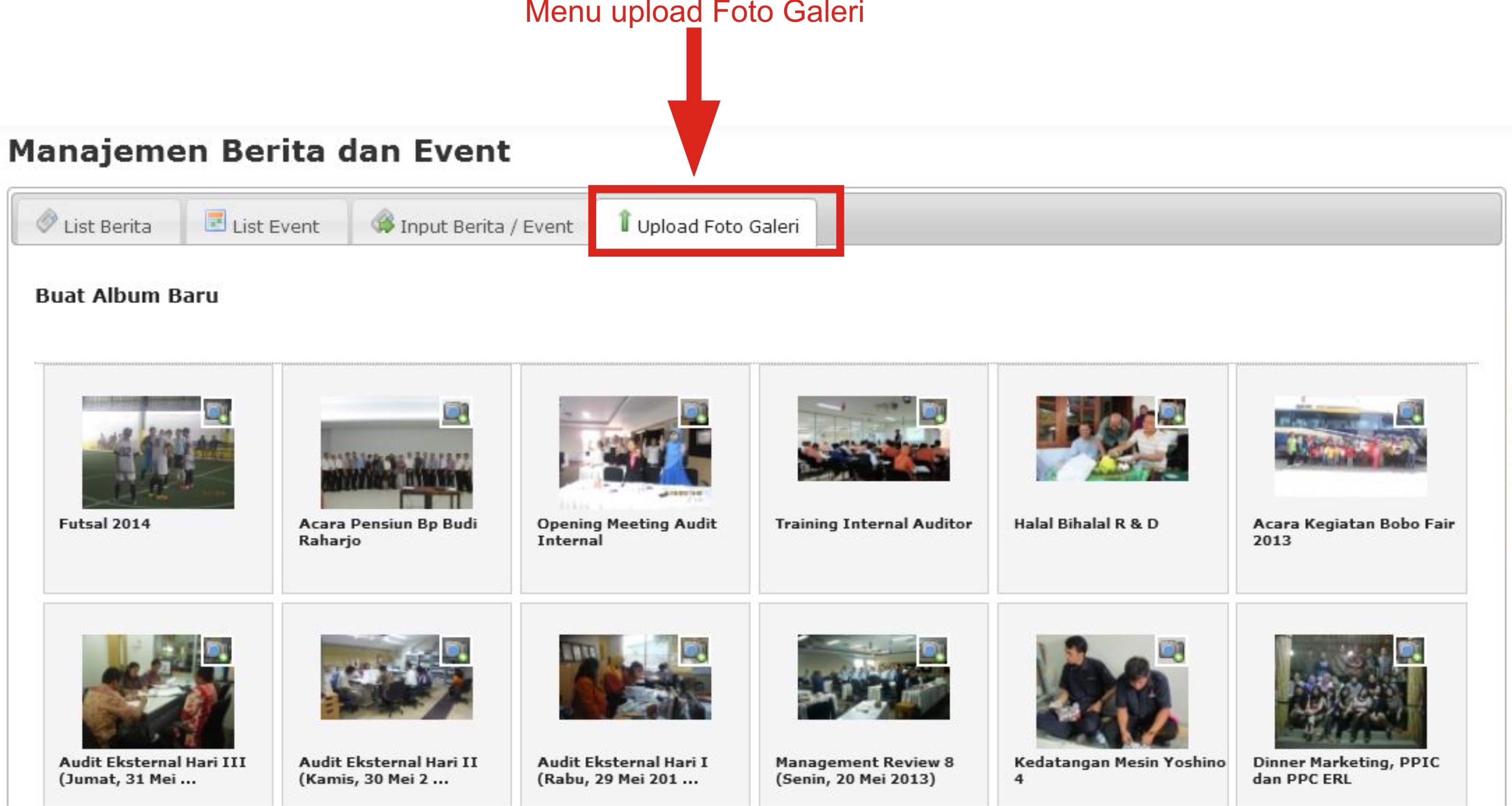 - Maka akan tampil halaman Management berita dan event, terdapat 4 Menu tab (List Berita,List Event,Input Berita/Event dan Upload Foto Gallery).