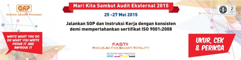 Pelaksanaan Audit Eksternal ke-6 oleh PT URS Services Indonesia akan dilakukan pada Hari/Tanggal, Senin-Rabu, 25-27 Mei 2015. Ruang Lingkup Audit adalah Seluruh bagian di PT GAP.